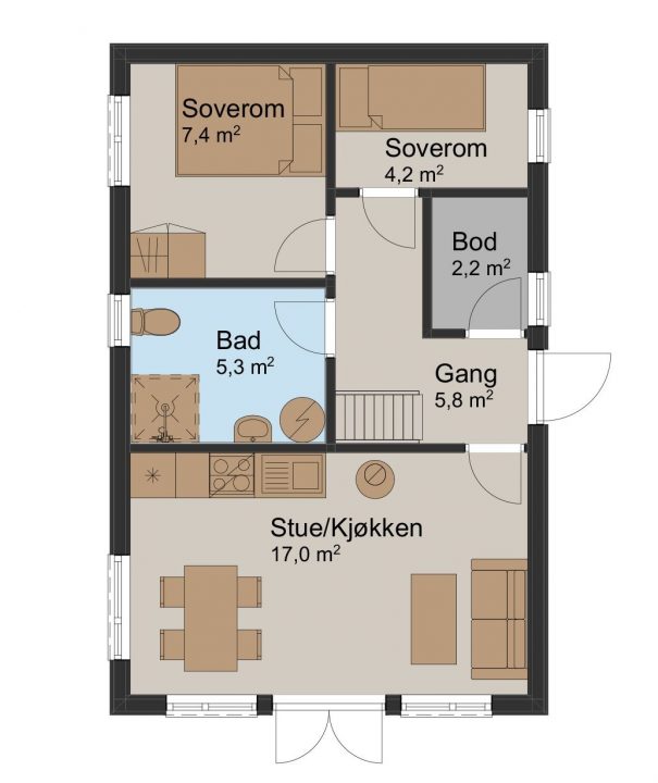 Selv om Fjelli ikke er av de største hyttene, inneholder den alt du trenger for å tilbringe ferien eller langhelgen på fjellet eller ved sjøen. Du kommer inn gjennom inngangspartiet til gangen hvor du har tilgang til en praktisk bod, hyttens to soverom, et bad med rom for wc og dusj, og hyttens allrom. Her finner du en åpen stue-/kjøkkenløsning med direktetilgang til uteområdet gjennom en dobbel verandadør i glass. Fra stue/kjøkken har du også tilgang til hemsen som kan gi ekstra soveplasser om du har gjester på besøk.