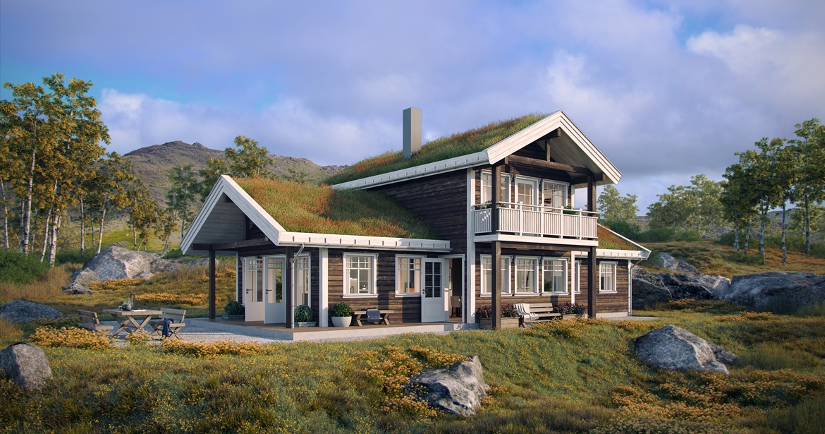 Blåfelden er en stor familiehytte med tradisjonell fasade der liggende kledning, torvtak og vakre detaljer gir deg den gode hyttefølelsen.