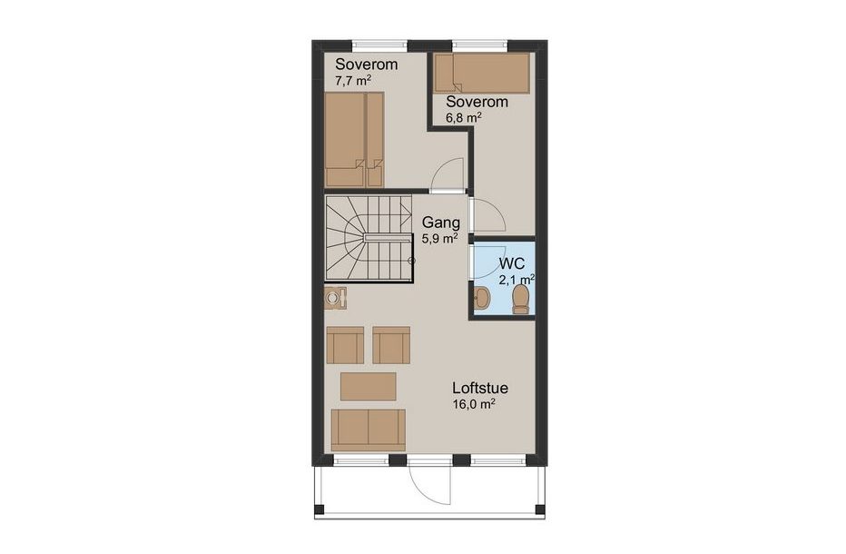Om du går opp trappen til andre etasje finner du ytterligere to soverom, et baderom og en trivelig loftstue med egen overbygd veranda. Her kan ungdommene få en stue for seg selv, mens de voksne hygger seg i første etasje.