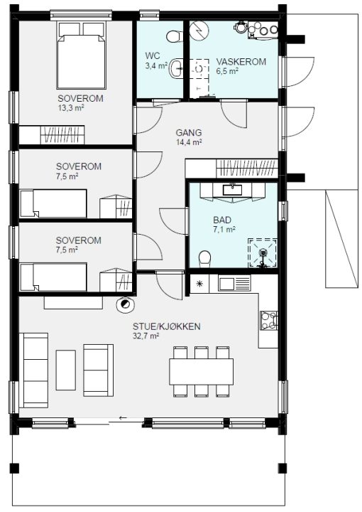 Boligen rommer hele tre soverom, et stort bad, vaskerom og et WC. I tillegg har Lande en stor og åpen stue- og kjøkkenløsning, prefekt for deg som vil samle familien.