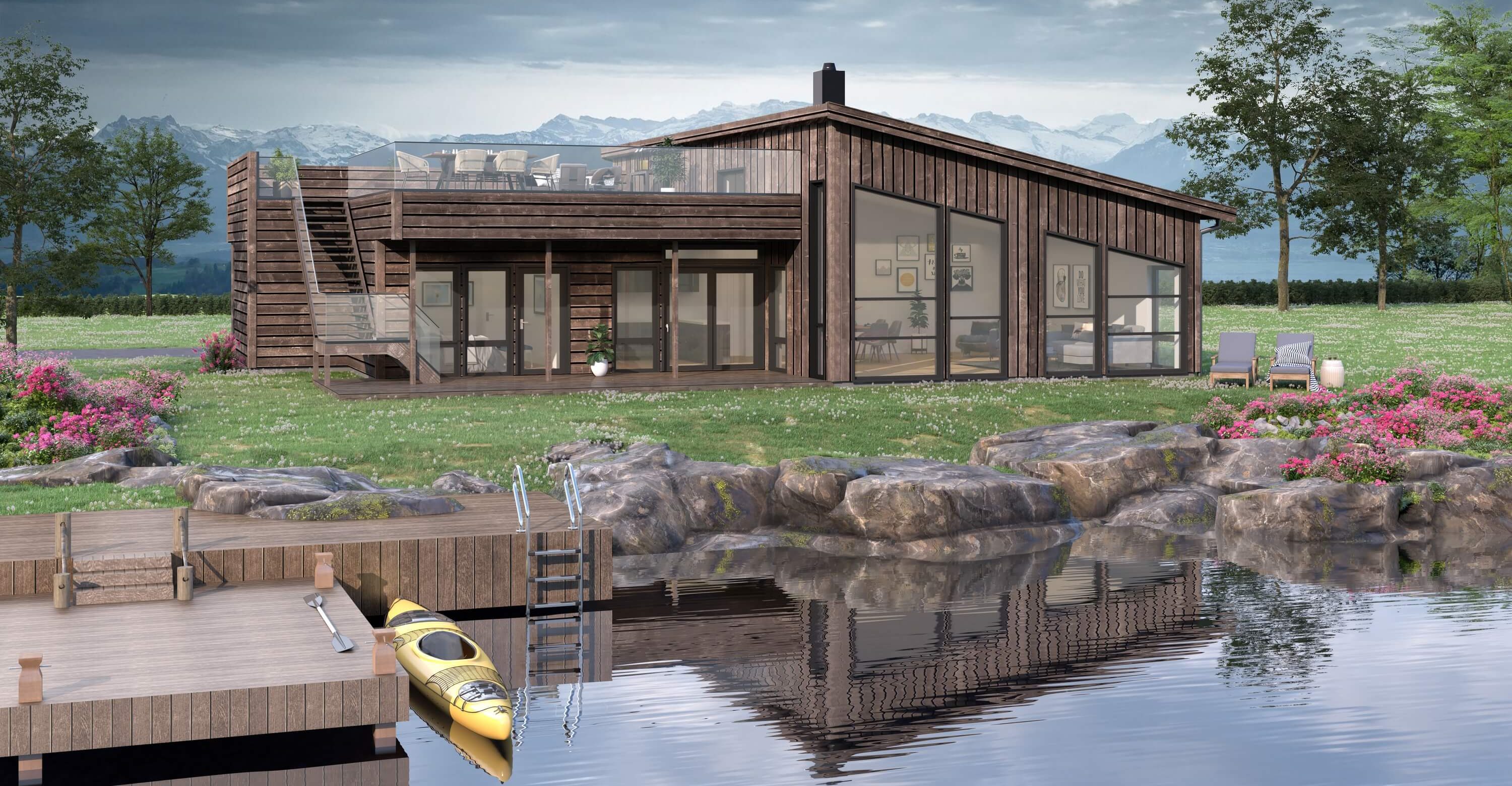 Med sin utradisjonelle utforming og store takterrasse får du med Vegsund en bolig som skiller seg ut. De store vinduene gir fasaden et åpent og spennende uttrykk. Her har du alle nødvendige funksjoner på ett plan.