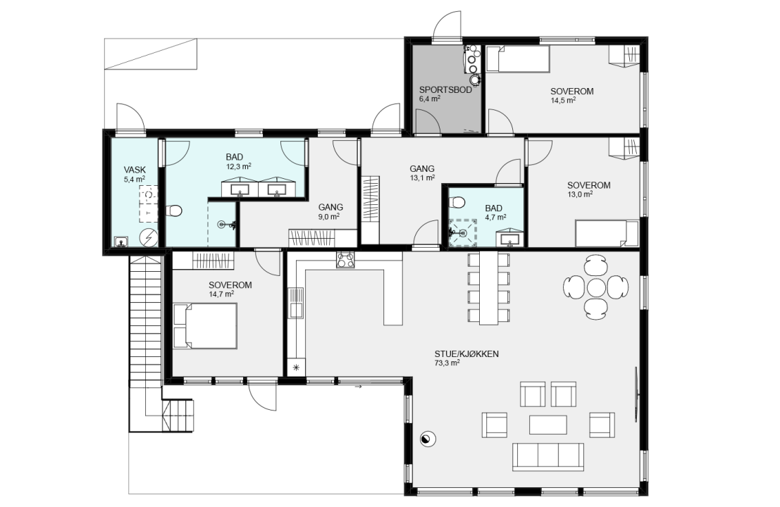 I denne boligen finner du tre store soverom, to bad og to store ganger med gode oppbevaringsmuligheter. Husets hjerte er det storslåtte åpne stue- og kjøkkenløsningen på over 70m2. Her i fra kan du ta deg videre til husets uteområde, samt en hærlig takterrasse hvor du kan invitere venner og familie til fest.