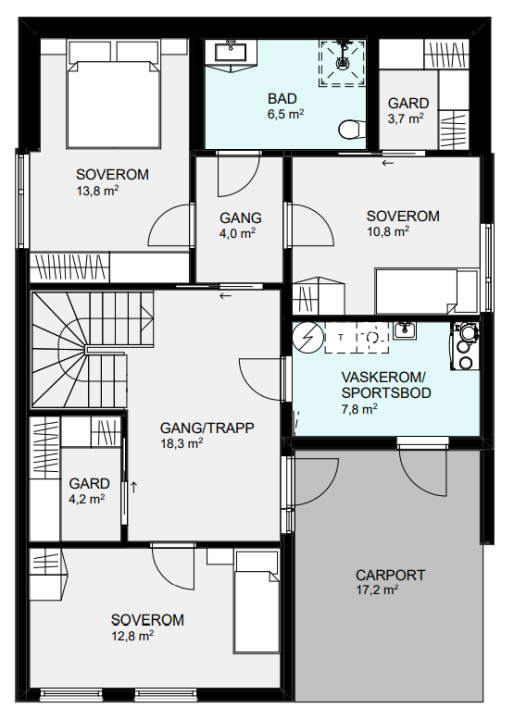 Fra boligens inngangsparti kan du ta deg videre i en stor gang med en walk-in garderobe. Videre finner du tre store soverom, et bad og et praktisk vaskerom. I andre etasjen finner du et soverom med egen walk-in garderobe og bad, et WC, en stor stue og et herlig kjøkken. Fra kjøkkenet kan du ta deg ut på boligens altan, perfekt når du vil nyte morgenkaffen i sola.
