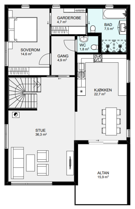 Luna strekker seg over tre plan, med en moderne og åpen romløsning som passer hele familien.