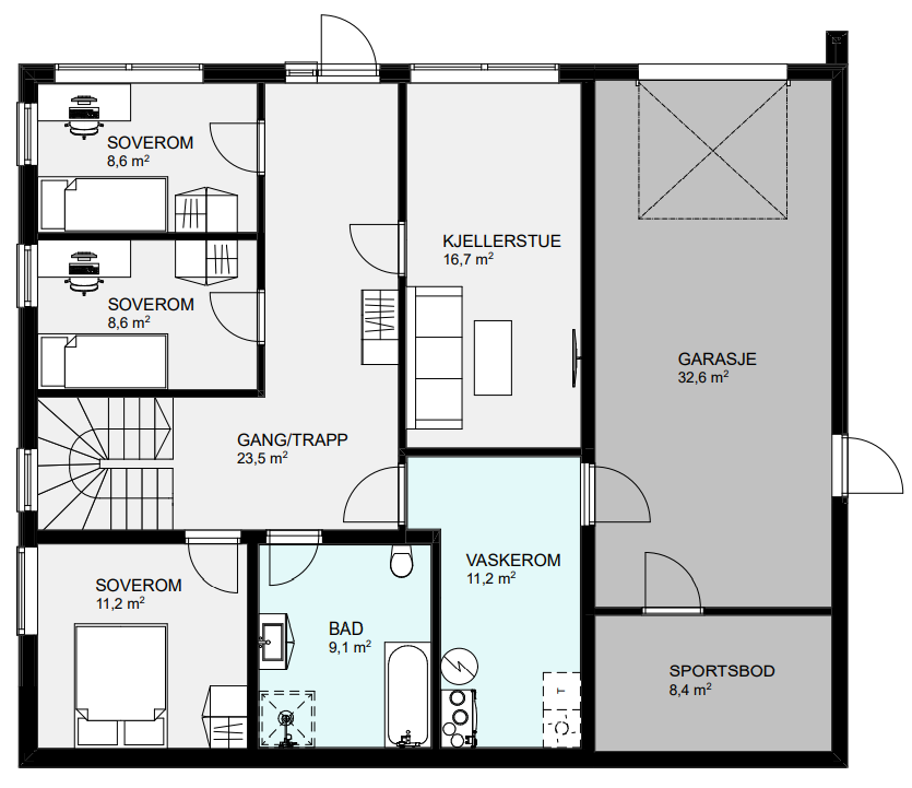 Fra boligens inngang, kommer du inn i en stor gang med gode garderobeløsninger. Videre kan du ta deg videre inn i boligens første bad, tre soverom, samt et praktisk vaskerom med egen utgang. I tillegg har Faro en ekstra TV-stue i første etasje.