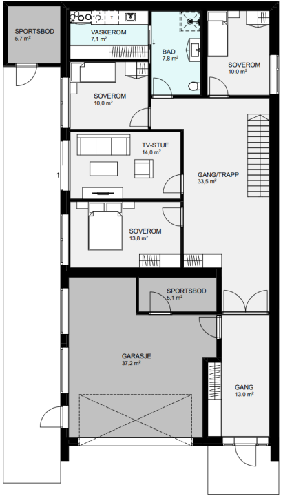 Boligen har garasje og sportsbod integrert i bygningskroppen.